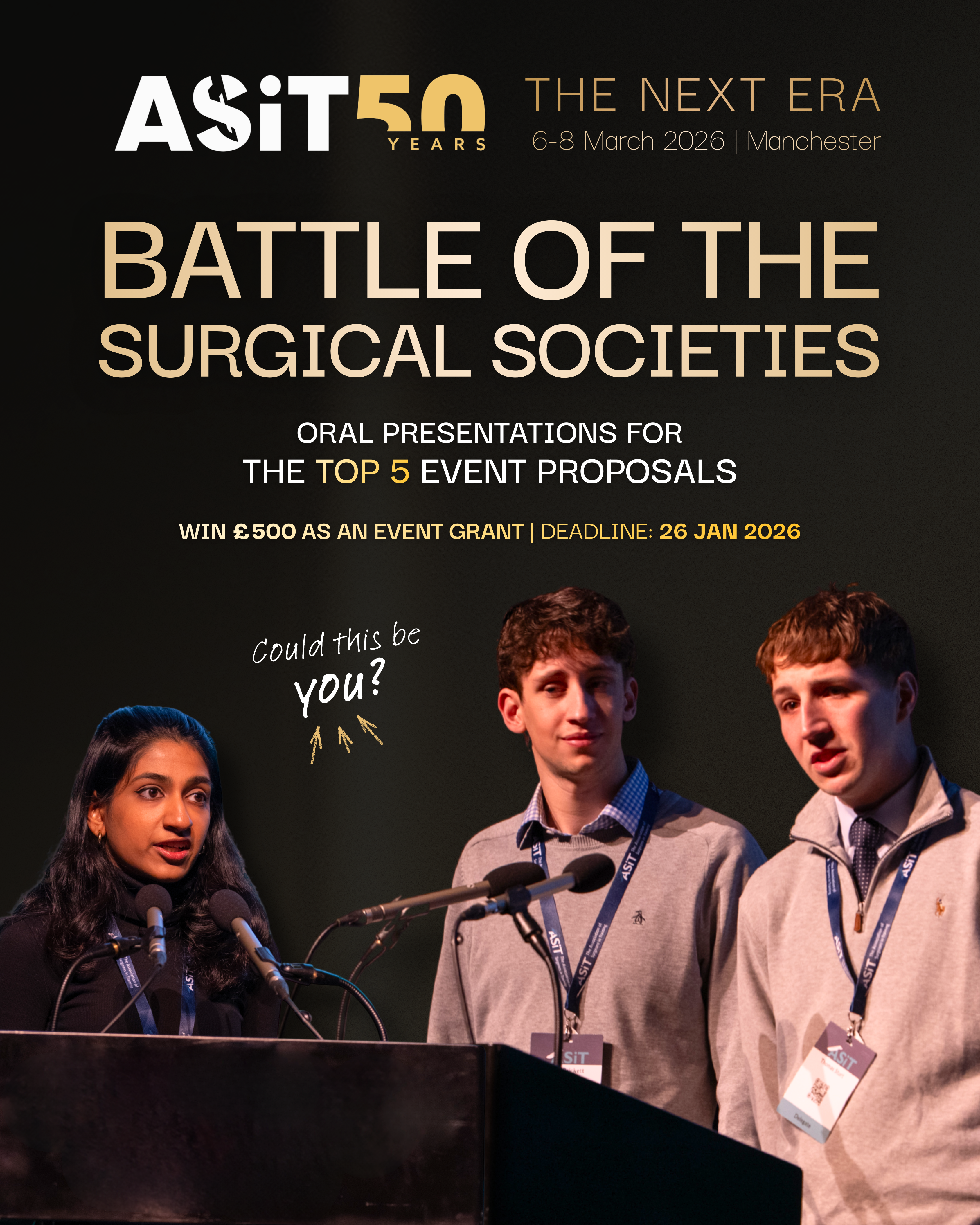 The Top 5 proposals will be invited to deliver an oral presentation of their ideas at our upcoming ASiT 2026 Conference in Manchester, where you will get the chance to compete live on stage in front of our judging panel as we crown this year’s Battle of the Surgical Societies winner.
